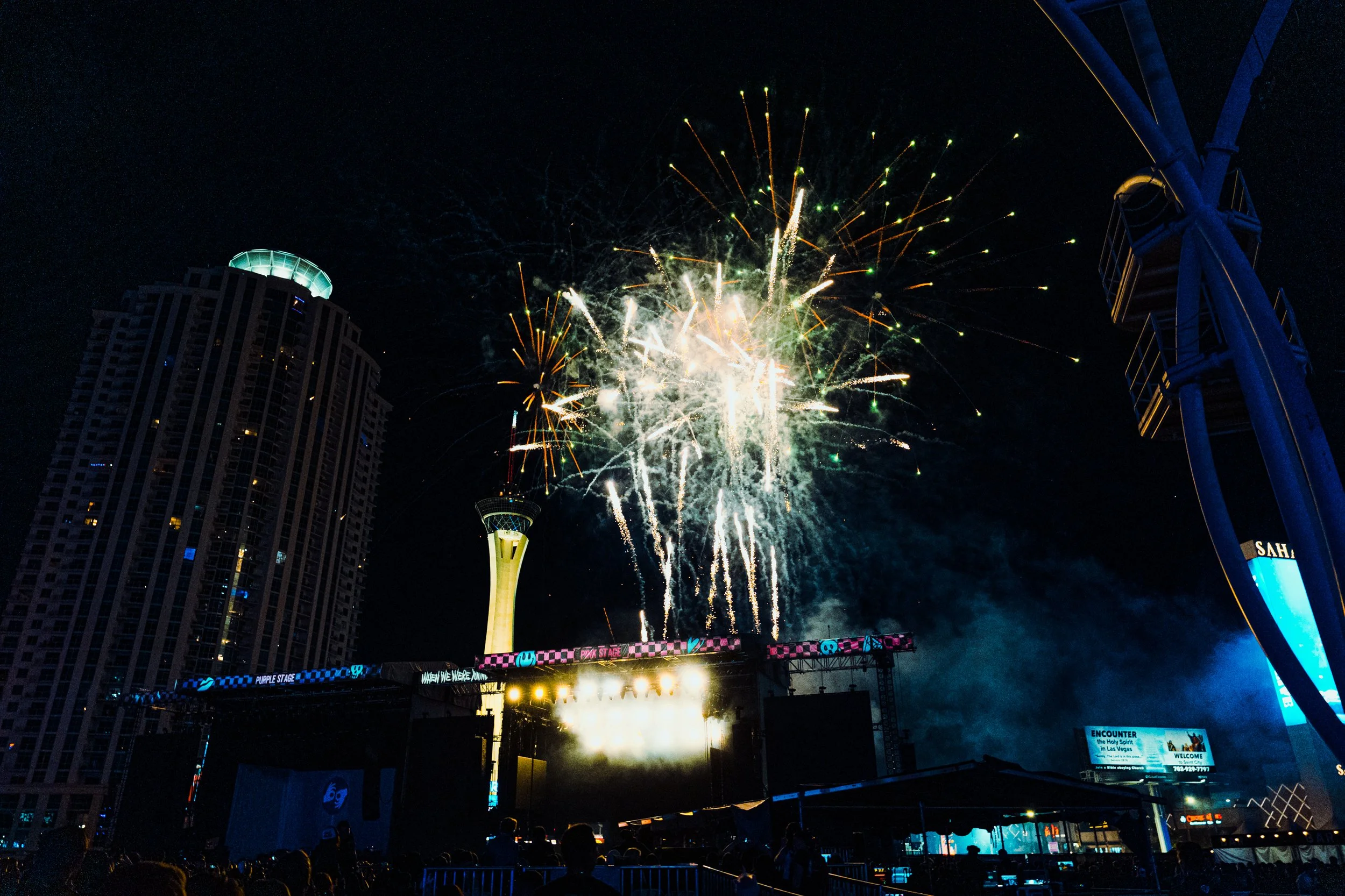 The Las Vegas Festival Grounds were alive with the hum of thousands of fans who, despite coming from all walks of life, felt united by this music. The festival organizers had gone above and beyond to make it feel like an emo wonderland with themed installations and iconic album artwork everywhere. Massive banners showcased each band performing their full album, and every corner of the grounds was decorated with imagery reminiscent of the early 2000s — from graffiti-style murals to neon signs that illuminated as the sun set, casting the whole festival in an atmospheric glow.